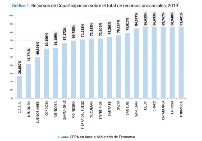 Las más dependientes son Formosa (93,4%), La Rioja (90,9%), Catamarca (89,76%), Chaco (86,7%), Jujuy (86,6%), San Juan (84,6%) y San Luis (79%). El resto recibió por coparticipación entre el 60% y el 76% de sus recursos totales, lo que ilustra el grado de importancia que tiene para todas las provincias en general.