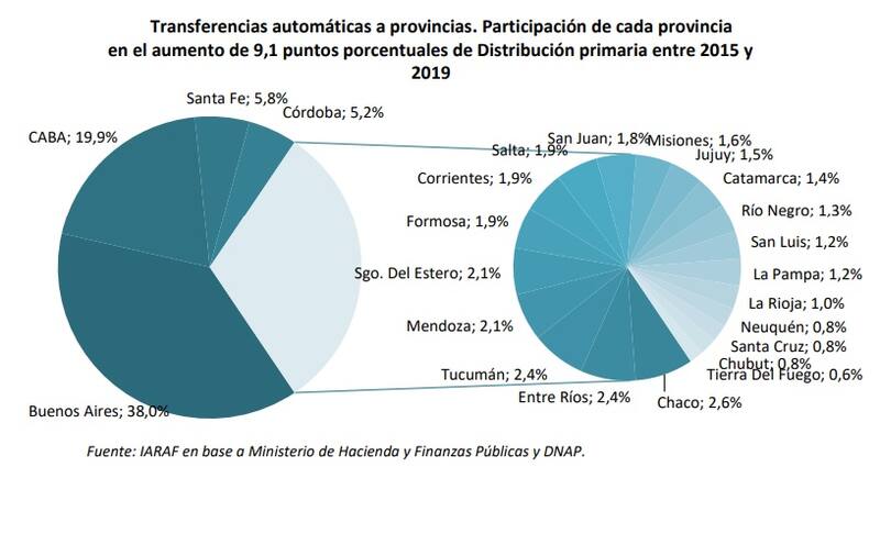 Las principales beneficiarias durante los últimos cuatro años del incremento de la participación primaria de los recursos coparticipables fueron la provincia deBuenos Aires, con un 38% del aumento, y la Ciudad de Buenos Aires, con un 20%, según un informe del Instituto Argentino de Responsabilidad Fiscal (Iaraf) sobre la coparticipación federal de impuestos.