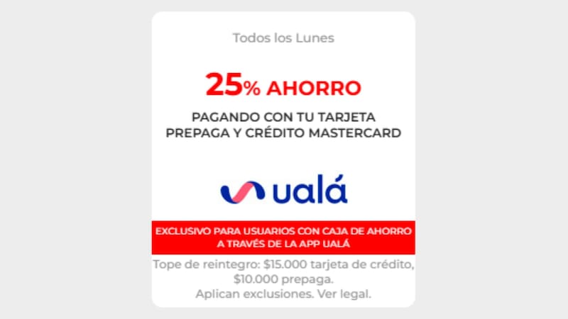 - $ 15.000 de reintegro para pagos con tarjeta de crédito Ualá, exclusivamente en un solo pago.