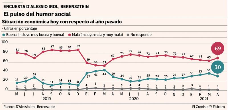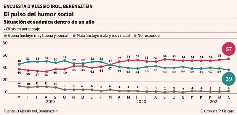 Así lo revela la última entrega del Monitor del Humor Social y Político que D'Alessio IROL/Berensztein realiza de forma exclusiva para El Cronista. El estudio, que relevó la opinión de 1216 adultos en todo el país durante el mes pasado, mostró que la visión negativa sobre el presente y el futuro de la economía se expande desde el votante opositor hasta quien se inclinó por el Frente de Todos (FdT) en 2019.