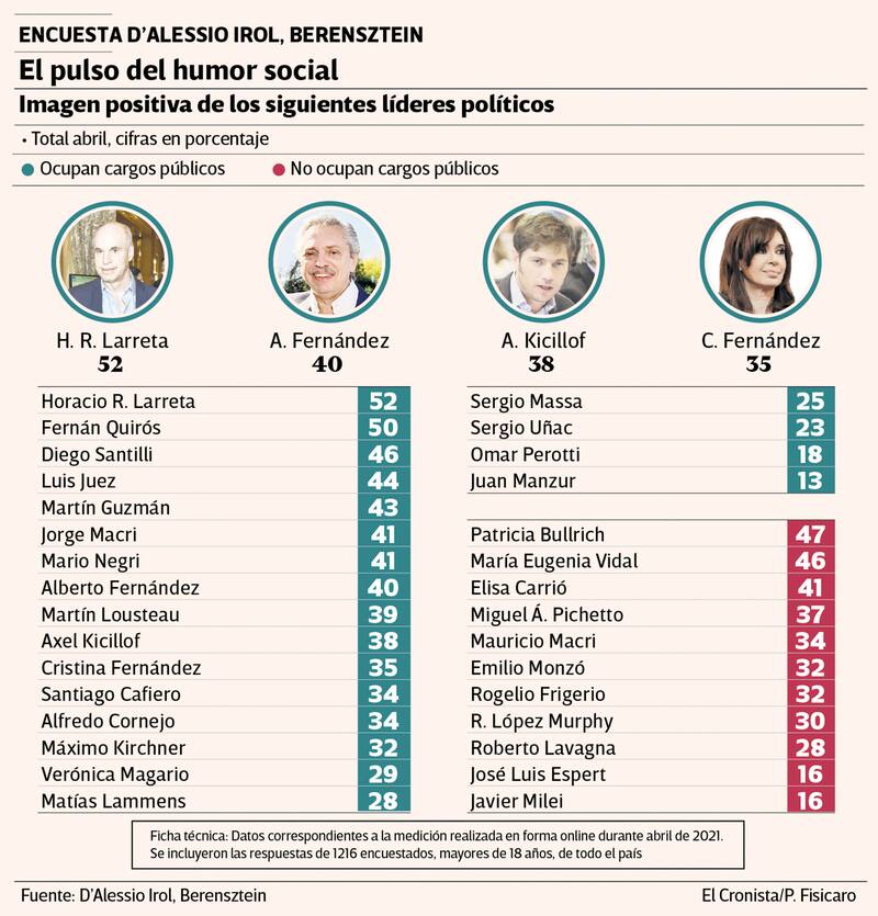 El dato acompaña al estancamiento de la imagen presidencial, que se mantiene con un balance negativo de 17 puntos (40 puntos de imagen positiva y 57 de negativa), lejos del +9 que observa el jefe de Gobierno porteño, Horacio Rodríguez Larreta (52 y 43), y del +20 que muestra el ministro de Salud de la Ciudad, Fernán Quirós (50 y 30).