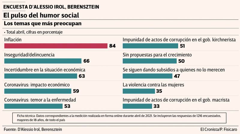 En efecto, la espiral inflacionaria sigue siendo el tema que desvela a la población, sumado al delito, la incertidumbre económica y el impacto del coronavirus en la economía, aún por encima del temor a la enfermedad.