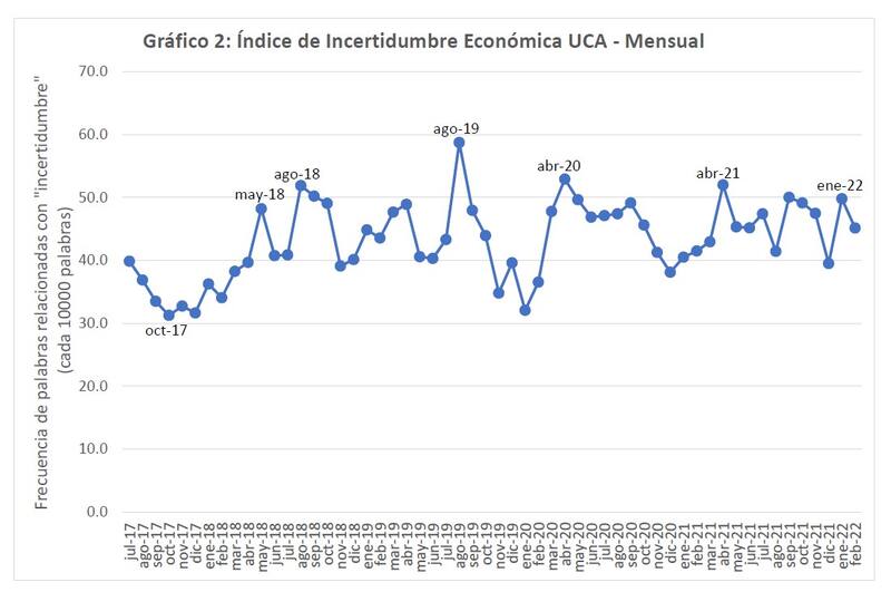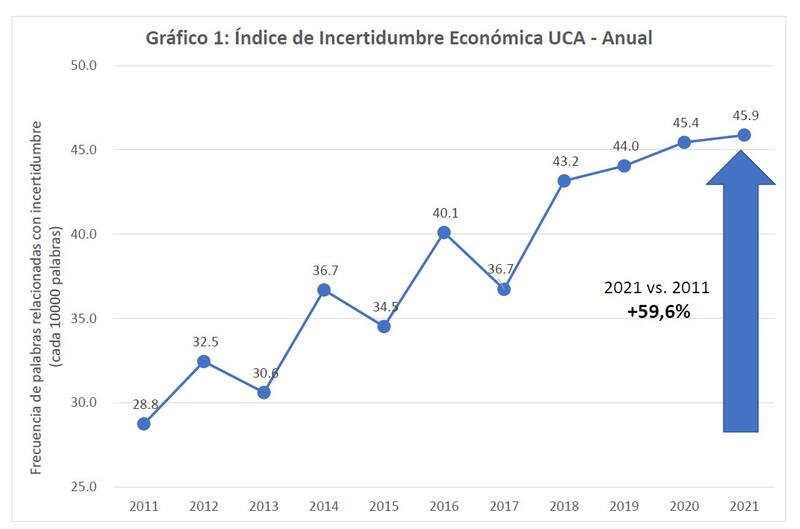Los argentinos perciben un horizonte de cada vez más preocupante y oscuro de la economía del país para el futuro inmediato: según el último Índice de Incertidumbre Económica UCA, en el año 2021, el valor del indicador fue 45,9, es decir, se produjo un aumentó de un 59,6% respecto de diez años atrás.
