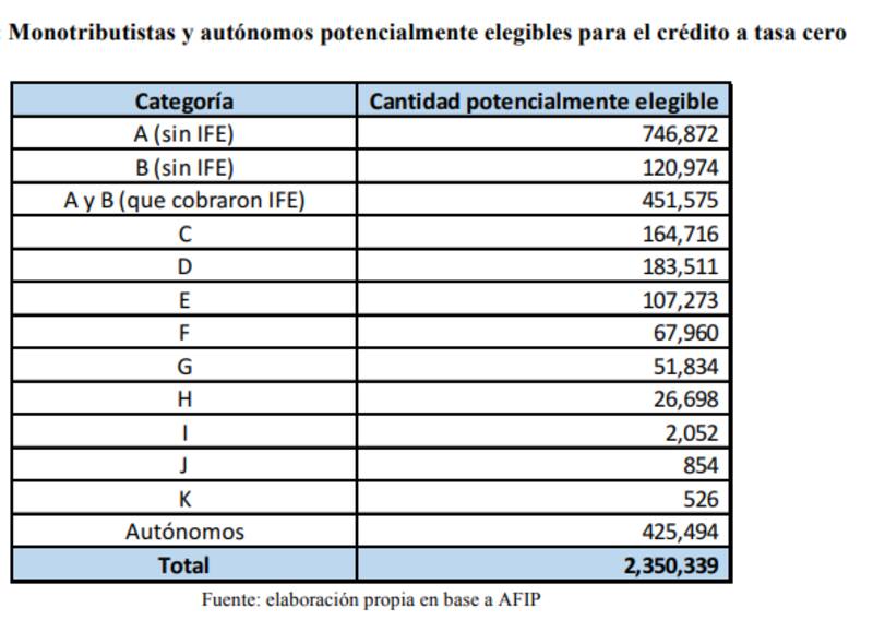 Y agregó: "Al igual que ocurre con los créditos para monotributistas, se excluyen a los que, además, cobran un sueldo o una jubilación. Son muchos los monotributistas (y autónomos) que tienen dos o más trabajos. Por lo cual, también, por esta otra exclusión, muchos quedarán fuera de los créditos."