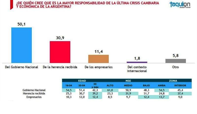 En el estudio, que fue realizado entre el 1 y el 24 de septiembre pasado, el 50,1% apuntó a la administración que encabeza Mauricio Macri por la crisis cambiaria y económica. En cambio, sólo un 30% de los encuestados considera que la crisis se debe a la "herencia recibida".
