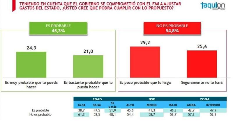 Por último, respecto del nuevo acuerdo firmado con el Fondo Monetario Internacional (FMI), el 54,8% consideró "improbable" que el gobierno de Cambiemos cumpla con las pautas establecidas por el organismo multilateral sobre la reducción de los gastos del Estado.