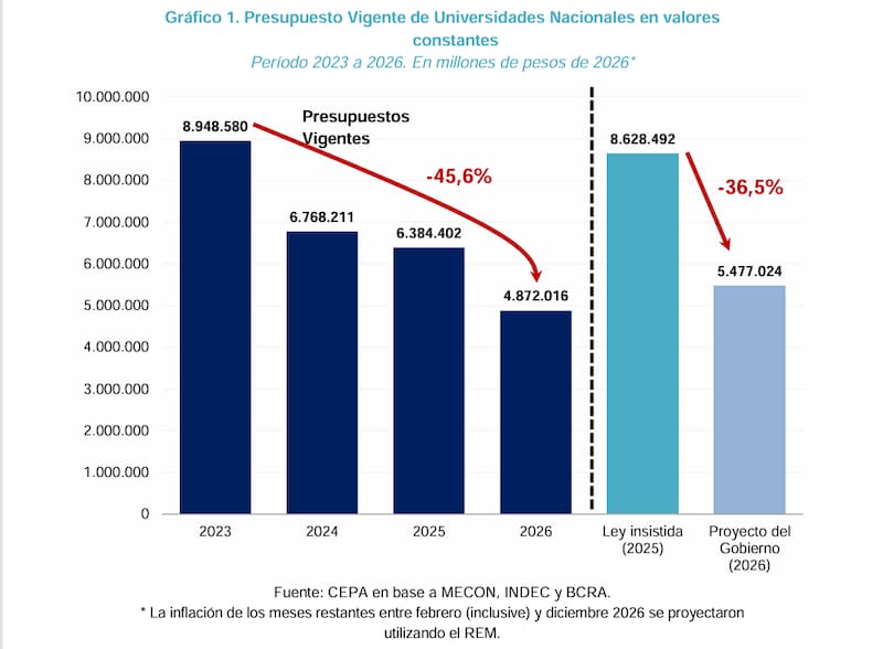 Según un informe del Centro de Economía Política Argentina (CEPA), el presupuesto de las universidades nacionales acumula una caída real de 28,7% entre 2023 y 2025. Si se considera el crédito vigente proyectado para 2026, la reducción alcanza el 45,6% respecto de 2023, uno de los retrocesos presupuestarios más importantes del sistema en los últimos años.