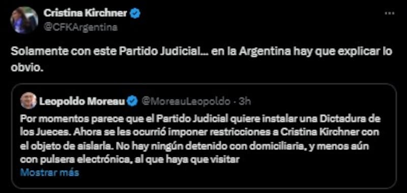 Cristina Kirchner volvió a cuestionar su condena y a los jueces que se la aplicaron. En redes sociales, la exmandataria se hizo eco de una publicación que había hecho el diputado Leopoldo Moreau.