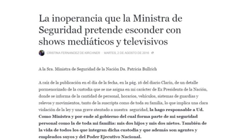 A través de una carta publicada en redes sociales, la exmandataria acusó a Bullrich de difundir información sobre la custodia dispuesta para ella y su familia al diario Clarín, y sostuvo que se trata de una “clara violación de la ley y una grave atentado a nuestra seguridad .