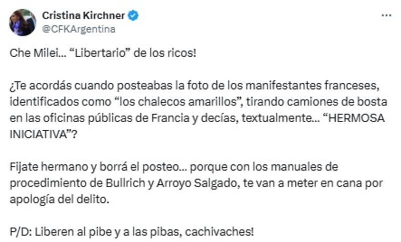 "Che Milei... ‘Libertario' de los ricos. ¿Te acordás cuando posteabas la foto de los manifestantes franceses, identificados como ‘los chalecos amarillos', tirando camiones de bosta en las oficinas públicas de Francia y decías, textualmente... ‘HERMOSA INICIATIVA'?", escribió la exmandataria.