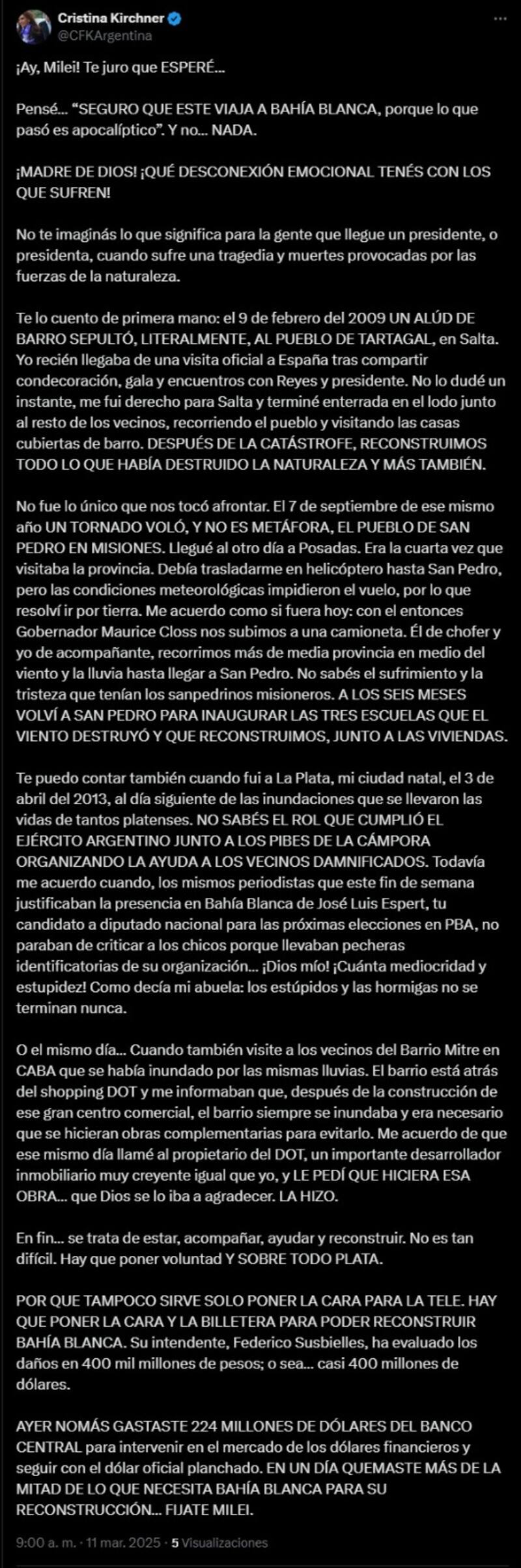 La expresidenta Cristina Fernández de Kirchner arremetió contra el presidente Javier Milei luego de las inundaciones en Bahía Blancay criticó que use fondos para intervenir el mercado y mantener planchado al dólar oficial.