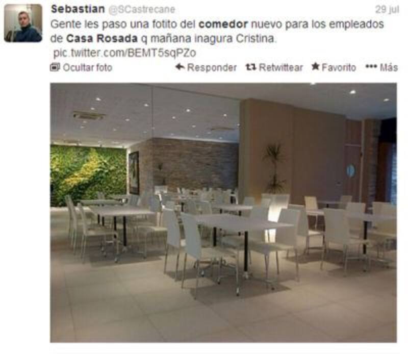 Para elogiarlo, dijo que “parece un restaurant comercial” y ponderó la “seguridad alimentaria” de la cocina, y que se “respetó parte de la arquitectura original”, mientras los restantes empleados se agolpaban sobre el ingreso al lugar, para ver a la Presidenta, que rara vez se presenta en el segundo nivel de Balcarce 50.