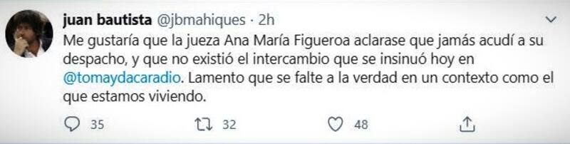 "Me gustaría que la jueza Ana María Figueroa aclarase que jamás acudí a su despacho, y que no existió el intercambio que se insinuó hoy en @tomaydacaradio. Lamento que se falte a la verdad en un contexto como el que estamos viviendo", señaló.