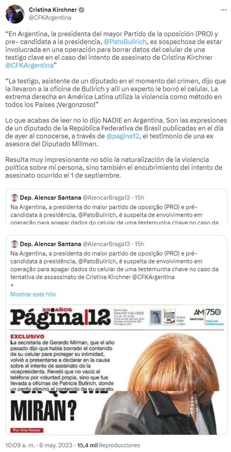 "'En Argentina, la presidenta del mayor Partido de la oposición (PRO) y pre- candidata a la presidencia, Patricia Bullrich, es sospechosa de estar involucrada en una operación para borrar datos del celular de una testigo clave en el caso del intento de asesinato de Cristina Kirchner'", inicia el texto del parlamentario del Partido de los Trabajadores (PT).