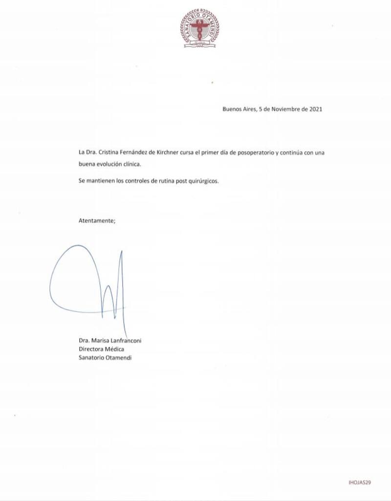 A través de un nuevo parte médico, la directora de la clínica del barrio porteño de Recoleta, Marisa Lanfranconi, señaló que la presidenta del Senado "cursa su primer día de posoperatorio y continúa con una buena evolución clínica".
