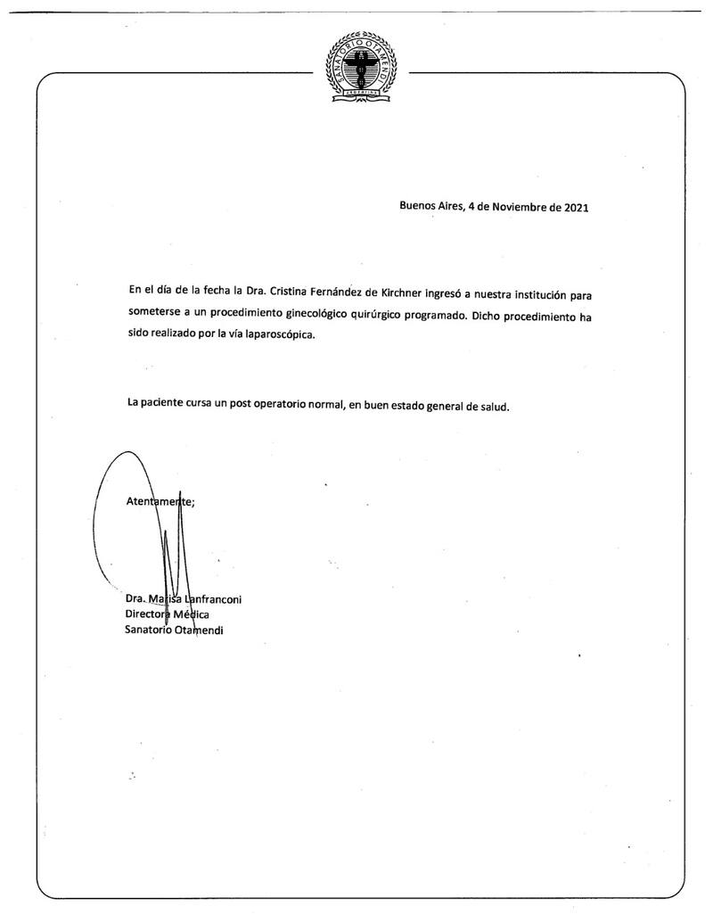Además, el parte oficial del centro médico señaló que Cristina Kirchner "cursa un post operatorio normal, en buen estado general de salud".