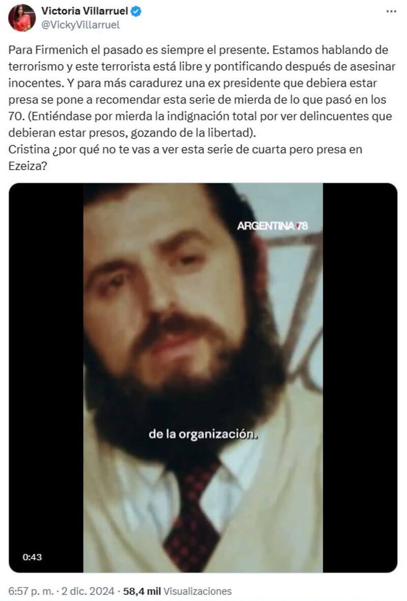 La vicepresidenta citó el posteo de CFK y afirmó: "Para Firmenich el pasado es siempre el presente. Estamos hablando de terrorismo y este terrorista está libre y pontificando después de asesinar inocentes. Y para más caradurez una expresidente que debiera estar presa se pone a recomendar esta serie de mierda de lo que pasó en los 70.