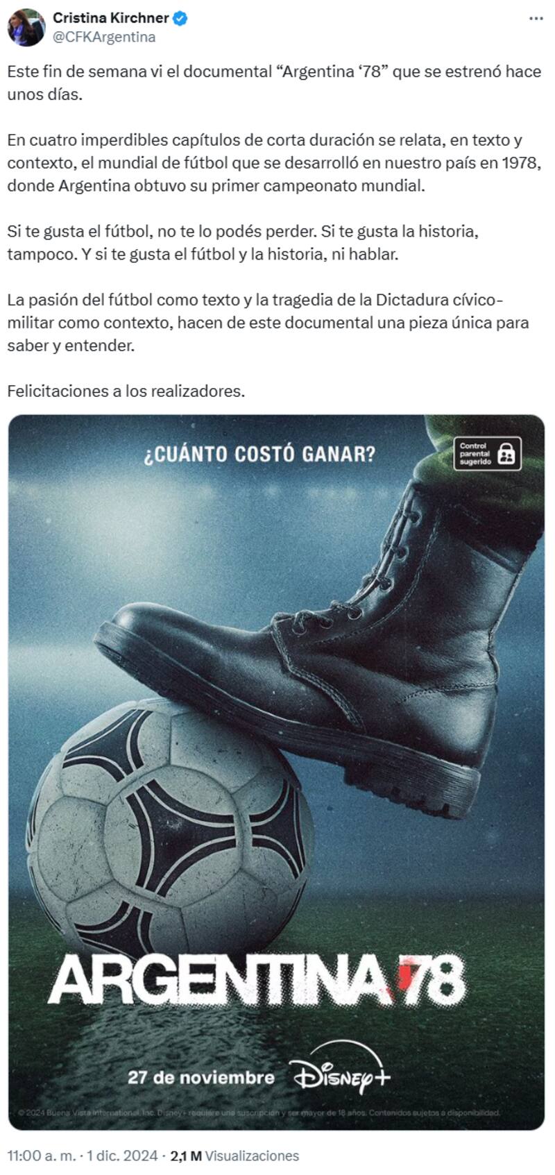 Fue este domingo cuando la expresidenta publicó un posteo en su cuenta de X recomendando la serie que se puede ver desde hace cinco días en la plataforma Disney+, que reconstruye a través de diferentes testimonios -entre ellos, el del exjefe de Montoneros, Mario Firmenich-, la coexistencia entre el Mundial de fútbol realizado en el país y la última dictadura cívico-militar.