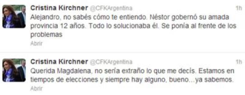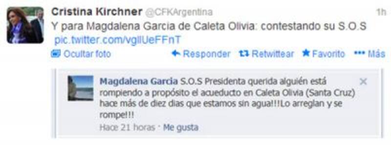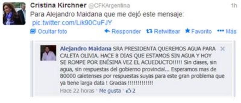 La presidenta Cristina Fernández usó Twitter para responder un reclamo dos vecinos de la santacruceña Caleta Olivia. Desde allí le escribieron al Facebook de la mandataria, Alejandro Maidana y Magdalena García, advirtiendo frente a la falta de agua, que afecta a la ciudad hace más de 10 días.
