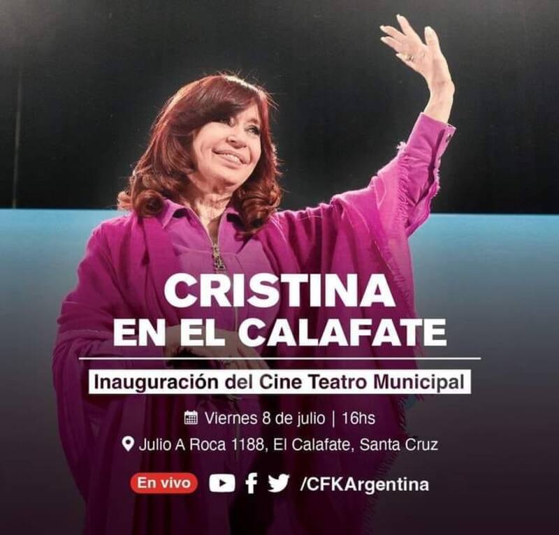 La vicepresidenta vuelve a hablar en público este viernes en lo que es su primera aparición pública tras la renuncia de Martín Guzmán. El acto es en el marco de la inauguración del Cine Teatro Municipal de El Calafate. La líder de la coalición gobernante estuvo acompañada por la gobernadora santacruceña, Alicia Kirchner, y el ministro de Educación, Jaime Perczyk.