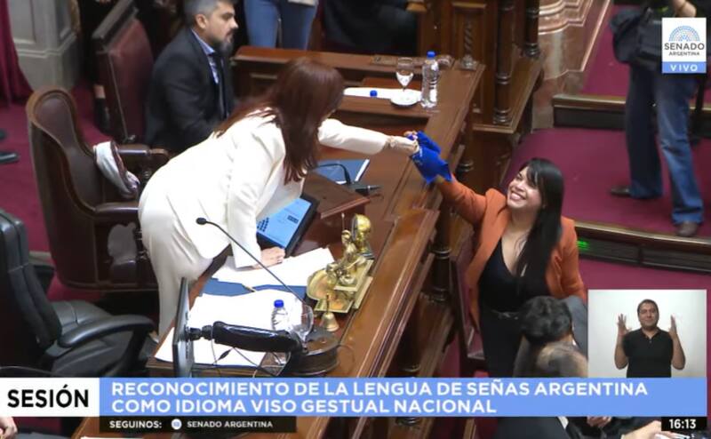 Visiblemente emocionada, la legisladora se acercó a Cristina Kirchner al final de su discurso para darle el típico pañuelo azul utilizado por la comunidad sorda para reclamar que la Lengua de Señas Argentina (LSA) sea ley. Entre aplausos, la vicepresidenta procedió a saludar con ese lenguaje a los palcos del recinto, que tenía allí presente a representantes de movimientos impulsores de la medida.