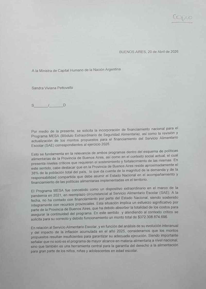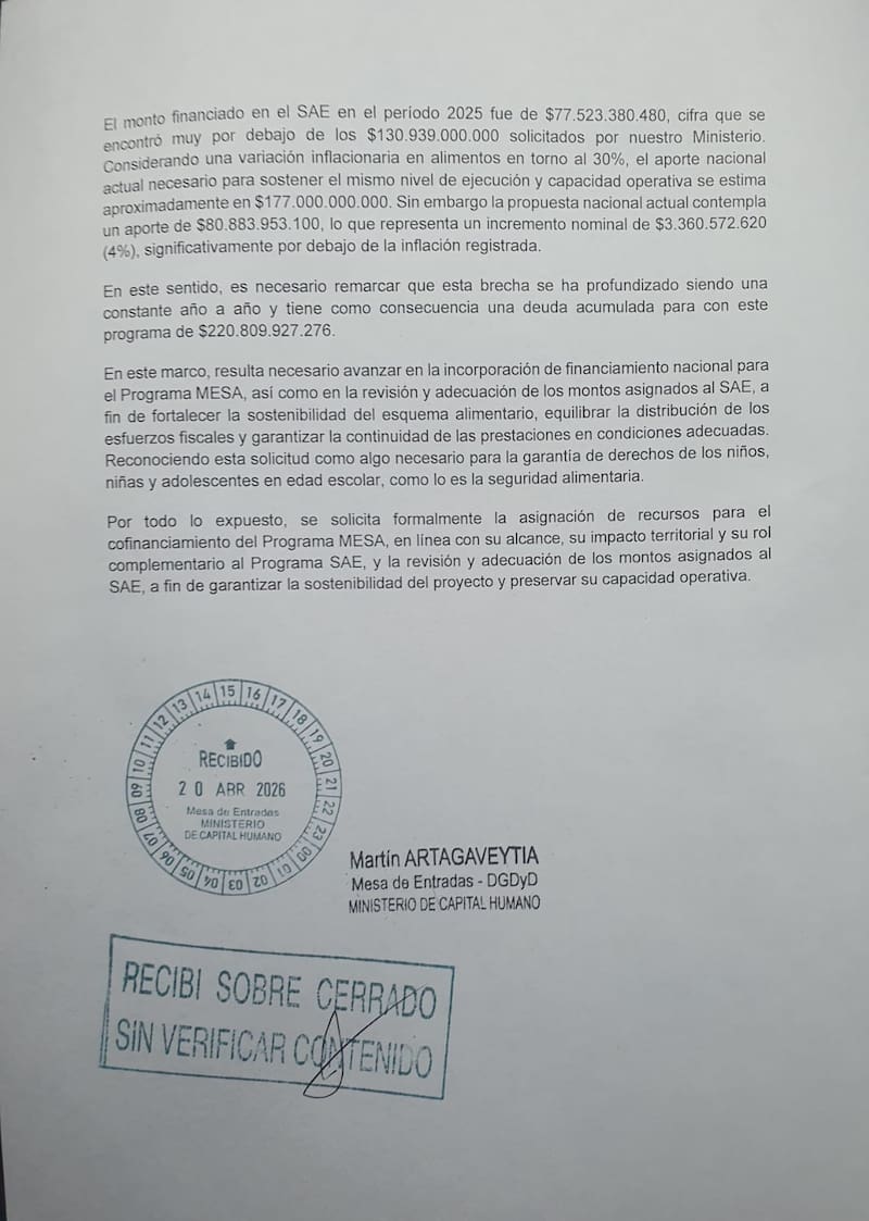 En la nota enviada a Nación, fechada el 20 de abril de 2026, la Provincia solicitó “la incorporación de financiamiento nacional para el Programa MESA (Módulo Extraordinario de Seguridad Alimentaria), así como la revisión y actualización de los montos propuestos para el financiamiento del Servicio Alimentario Escolar (SAE) correspondientes al ejercicio 2026”.