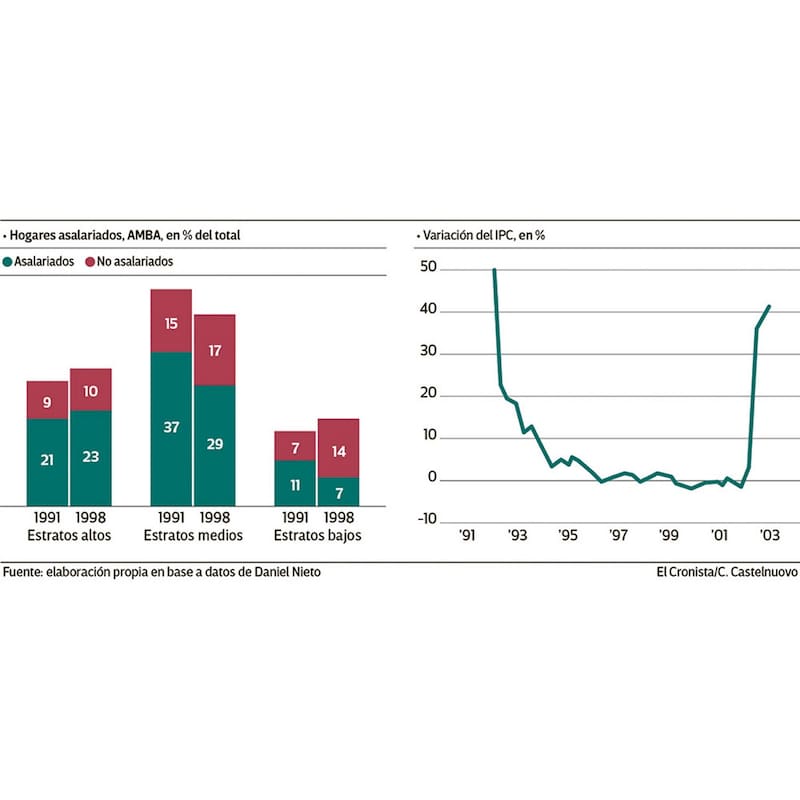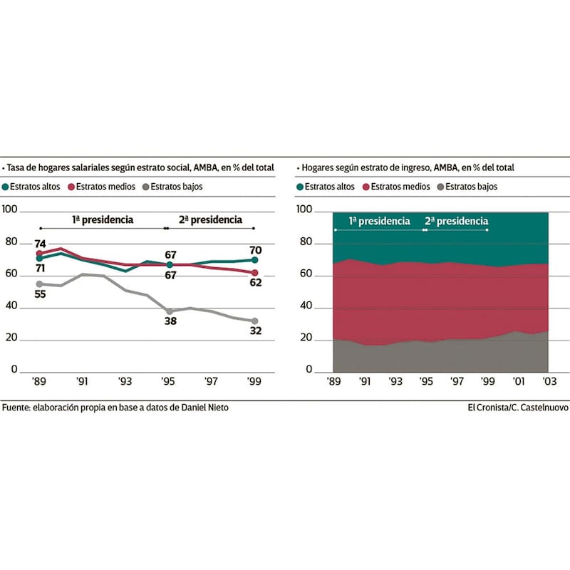 La pérdida de puestos de trabajo fue a favor de los empleos en el sector informal dado que entre 1989 y 2002 el trabajo no registrado aumentó un 12%. Previo a la Convertibilidad un 37% de los hogares pertenecientes a estratos medios eran asalariados con empleo formal y el 15% no asalariados. Para 1998 un 17% era no asalariado. En la clase baja ese impacto fue mayor: pasó de haber un 7% de hogares no asalariados a un 14%.