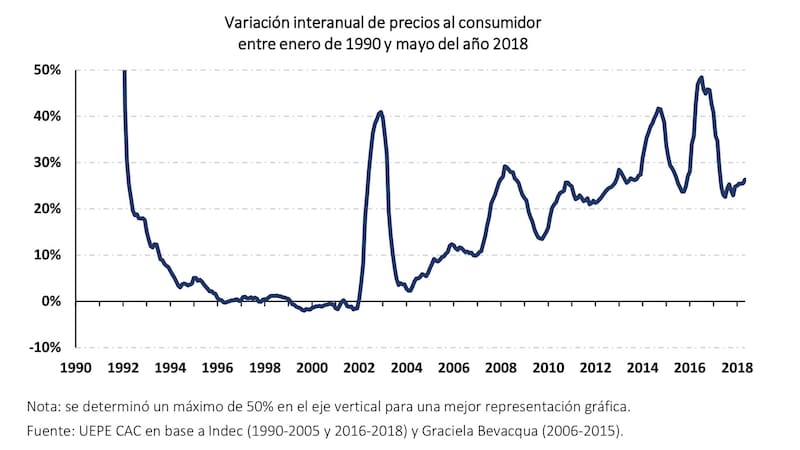 Entre 1999 y 2001 mientras el PBI se contraía, el proceso deflacionario se acentuó. Al anunciarse el default de la deuda externa y la devaluación en el primer semestre de 2002 el tipo de cambio se triplicó y como esta suba se trasladó a los precios la inflación aumentó 25,6%.