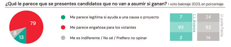 El 79% de los encuestados considera a la candidatura testimonial como engañosa para los votantes, particularmente aquellos que eligieron a Javier Milei en el ballottage de 2023 (93% se expresó así) pero también la mayor parte de quienes no lo votaron (62%).