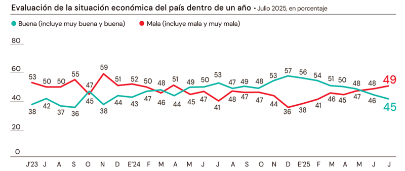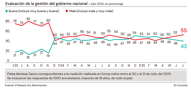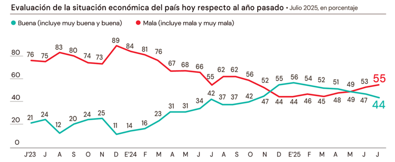 Así lo revela la última entrega delMonitor de Humor Político y Social, que elabora en exclusiva D'Alessio IROL/Berensztein para El Cronista. El estudio online, realizado el 30 y 31 julio a 1000 adultos en todo el país, reflejó un pesimismo económico que crece en la medida en que se acerca el paso por las urnas y enmarca una caída persistente en la imagen del Gobierno.