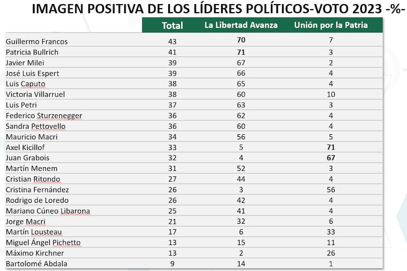 La escena política la completa un progresivo deterioro de la imagen presidencial, que desciende al 39% de las opiniones positivas desde el 51% con el que asumió la gestión, ubicándose por detrás del jefe de Gabinete, Guillermo Francos (43%), y la ministra de Seguridad, Patricia Bullrich (41%). Pero Milei preserva aún el apoyo de dos de cada tres de los votantes que tuvo hace dos años y se muestra por encima de representantes de la oposición como Axel Kicillof (33%), Juan Grabois (32%) y Cristina Kirchner (26%).