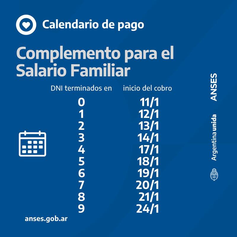 ANSES activará el martes 11 de enero el nuevo calendario de cobro de la Asignación Familiar por Hijo junto al pago del Complemento del Salario Familiar para las y los trabajadores englobados en el Sistema Único de Asignaciones Familiares (SUAF).