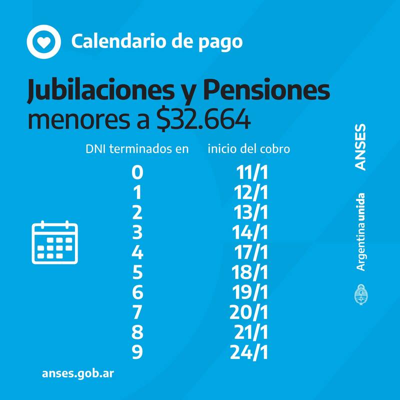 Luego, el martes 25 de enero, ANSES activa el cronograma de pago para jubilados y pensionados con haberes mayores a $ 32.664.