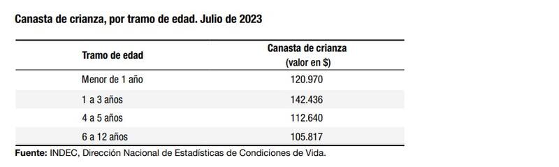 El INDEC divide el costo total de criar un hijo según en la edad en el "Costo de bienes y servicios" y en "Costo del cuidado". El primero dio para julio 28.200 pesos para el menor de 1 año; 36.412 pesos en el caso de los niños de 1 a 3 años; 46.375 pesos, de 4 a 5 años y 57.529 pesos, de 6 a 12 años. En tanto, el "Costo del cuidado" supuso en julio 92.770 pesos para el menor de 1 año; 106.023 para 1 a 3 años; 66.265 pesos, para los infantes de 4 a 5 años y 48.288, para los de 6 a 12 años .