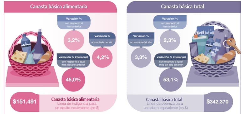 Si bien los informes del INDEC publicados recientemente se centran en la Canasta Básica Alimentaria (CBA) y la Canasta Básica Total (CBT) pueden establecer las líneas de indigenciay de pobreza.