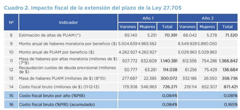 Según el informe al que accedió El Cronista, la extensión de la moratoria implicaría un costo fiscal del 0,084% del PIB para el primer año y de 0,081% del PIB para el segundo año, totalizando entre ellos un 0,165% del PIB. En millones de pesos, el costo fiscal bruto sería de $ 726.271 para el primer año, mientras que para el segundo año sería de $ 871.421 millones de pesos.
