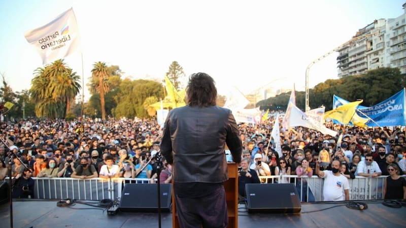 "Hay que derrumbar el modelo defendido por la casta política, que lo único que ha generado es transformar el país más rico del mundo en uno de los países más pobres del mundo", apuntó el precandidato a diputado nacional frente a una multitud de jóvenes que se congregaron en la Plaza Holanda. "Hoy comienza la reconstrucción de la Argentina. El año pasado festejaba acá mi cumpleaños, y me comprometía a que me iba a meter en política, que me iba a meter en el barro para sacar a los políticos con patadas en el culo", agregó.