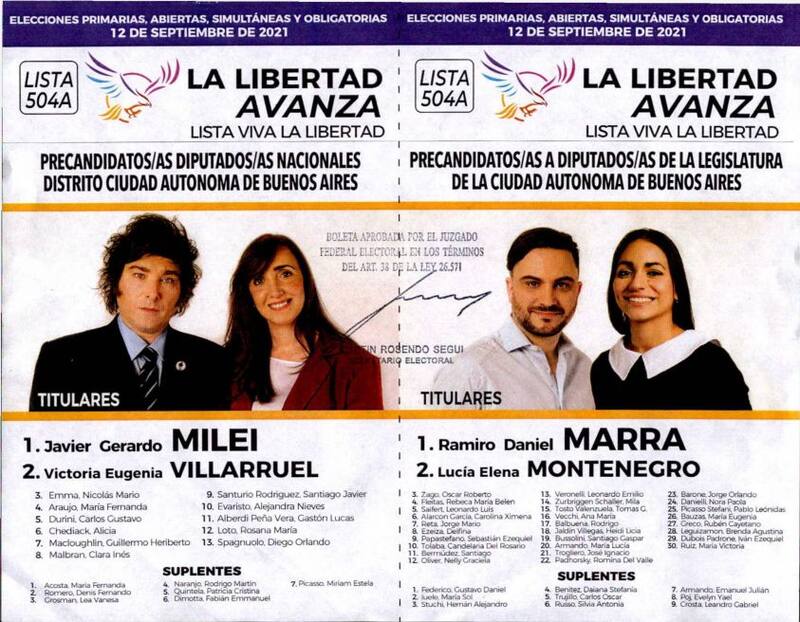 Milei encabeza la lista 504A"La Libertad Avanza" junto a Victoria Eugenia Virraruel, mientras que para la Legislatura porteña y bajo el mismo sello, el youtuber y director de Bull Market Group, Ramiro Marra lidera a la par de Lucía Elena Montenegro.