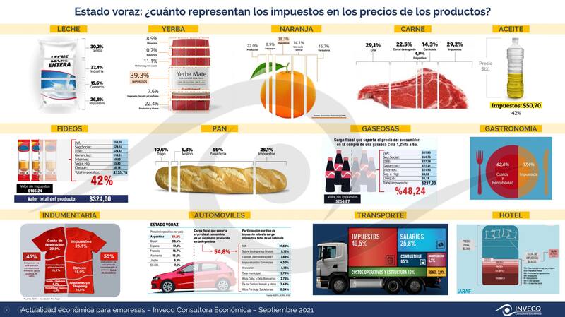 En el informe ya mencionado se analiza puntualmente la presión impositiva sobre la leche, la yerba mate, las naranjas, la carne, el aceite, los fideos, el pan, las gaseosas, la gastronomía en general, la indumentaria, los automóviles, el transporte y la industria hotelera; con el más elevado siendo el sector automotriz con un 54,8% de recarga.