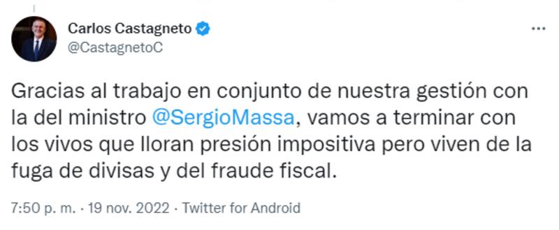 En ese sentido, Castagneto reconoció el trabajo en conjunto de la gestión de AFIP con la del ministro Massa. "Vamos a terminar con los vivos que lloran presión impositiva pero viven de la fuga de divisas y del fraude fiscal", enfatizó sobre el impacto del intercambio que se pondrá en marcha a partir del próximo año.