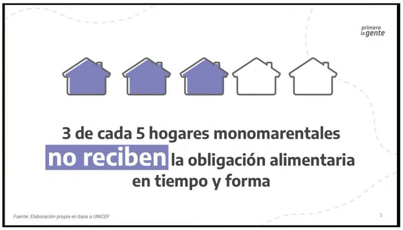 Según datos de Unicef, la mitad de los hogares monomarentales no reciben en tiempo y forma la cuota alimentaria, mientras que "un 12% lo reciben una vez si y otra no", indicó la directora nacional de Economía y Género, Sol Prieto.