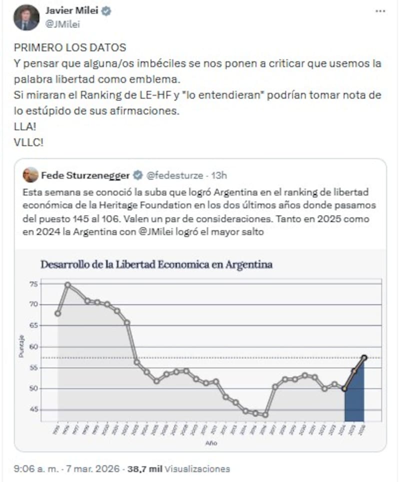 El dato no paso desapercibido para Javier Milei, quien aprovechó la mejora para cuestionar a quienes critican el uso del concepto de “libertad” como símbolo de su gestión. “PRIMERO LOS DATOS”, publicó el presidente en sus redes sociales y cargó contra la oposición: “Y pensar que alguna/os imbéciles se nos ponen a criticar que usemos la palabra libertad como emblema. Si miraran el Ranking de LE-HF y ‘lo entendieran’ podrían tomar nota de lo estúpido de sus afirmaciones”.