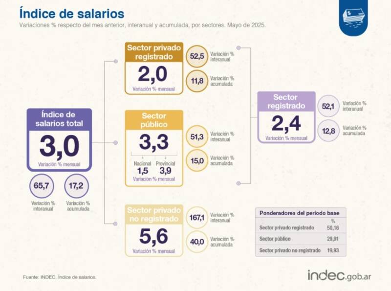 El índice de salarios del Instituto Nacional de Estadísticas y Censos (INDEC) arrojó, en mayo, una suba del 3% mensual y 65,7% comparado con el mismo mes del año anterior.