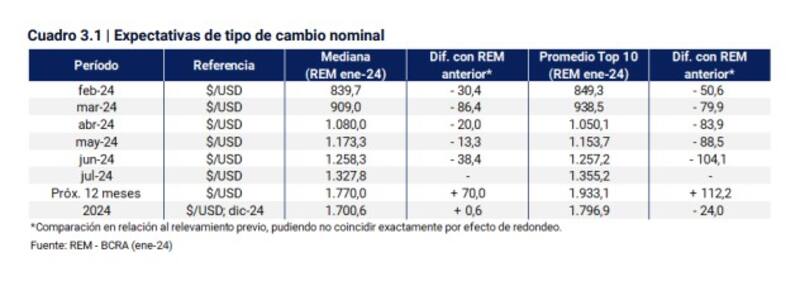 El informe se realizó previo a que se caiga la sesión de la Ley Ómnibus en la Cámara de Diputados, que podría repercutir en el tipo de oficial, entre otras cosas. En esta línea, los analistas del REM habían pronosticado que el tipo de cambio nominal de febrero sería de $839,7.