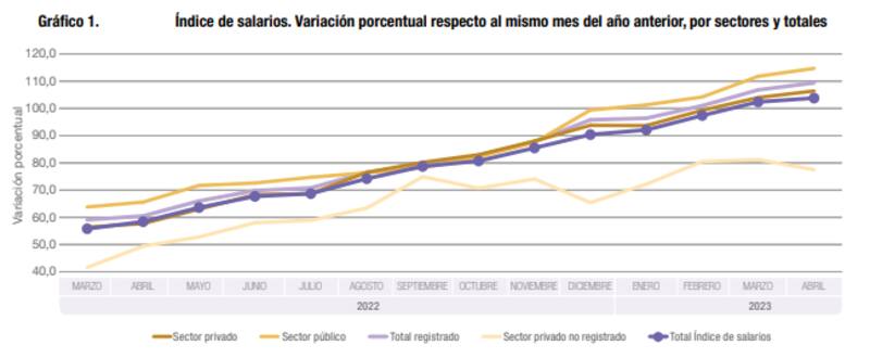 Los salarios en general registraron en abril un incremento de 5,7%, esto es 2,7 pp por debajo de la inflación minorista medida por el Instituto Nacional de Estadística y Censos (INDEC) correspondiente al cuarto mes de 2023.