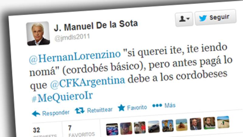 "@HernanLorenzino "si querei ite, ite iendo nomá" (cordobés básico), pero antes pagá lo que @CFKArgentina debe a los cordobeses #MeQuieroIr", escribió el Gobernador José Manuel de la Sota en su cuenta de Twitter.