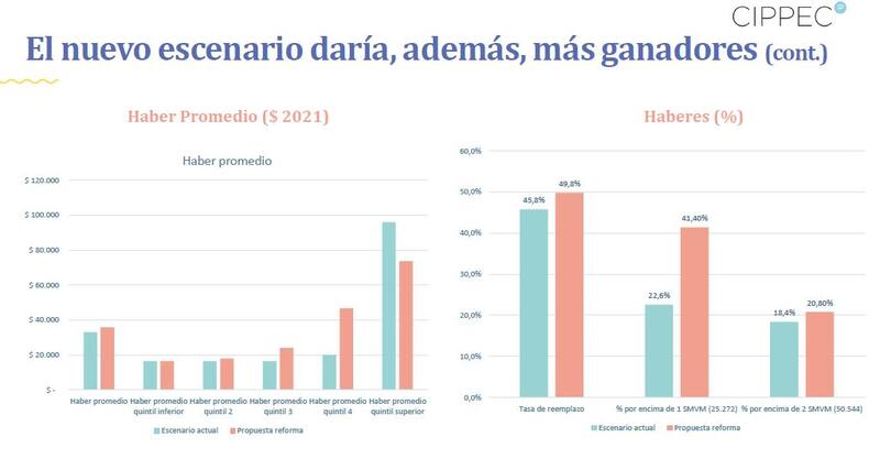 Según explican, el nuevo modelo tiene un piso universal, y luego un adicional contributivo basado en todos los años aportados por la persona. "Esto da una distribución más progresiva e igualitaria de los recursos contribuidos al sistema", afirman. Bajo esta recomposición de los diferentes sistemas y la redistribución equitativa de los fondos, CIPPEC calcula que los cuatro quintiles menos pudientes tendrán subas en el haber promedio; mientras que el quintil superior será el único desfavorecido.