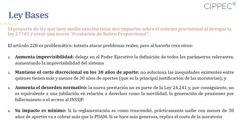 El Gobierno impulsa en la Ley Bases la derogación de la Ley 27.705 de moratoria previsional (artículo 227) y la creación de una nueva "Prestación de Retiro Proporcional". Desde CIPPEC coinciden con esa primera medida, aunque piden que se condicione un plazo estipulado para que el Poder Ejecutivo presente un proyecto de ley de reforma integral del sistema.