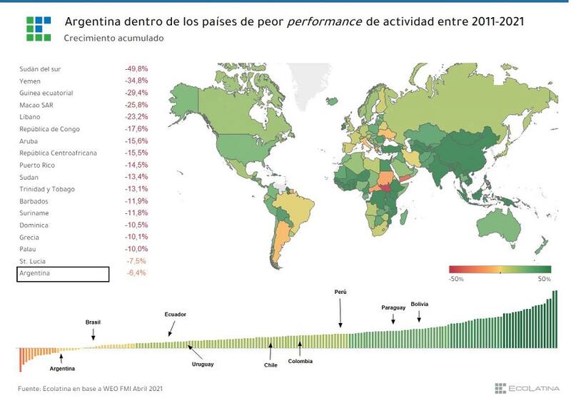 El informe subraya que, como resultado de este estancamiento, la Argentina quedó en el puesto 175 sobre un total de 192 países en el ranking de crecimiento de la década en cuestión.