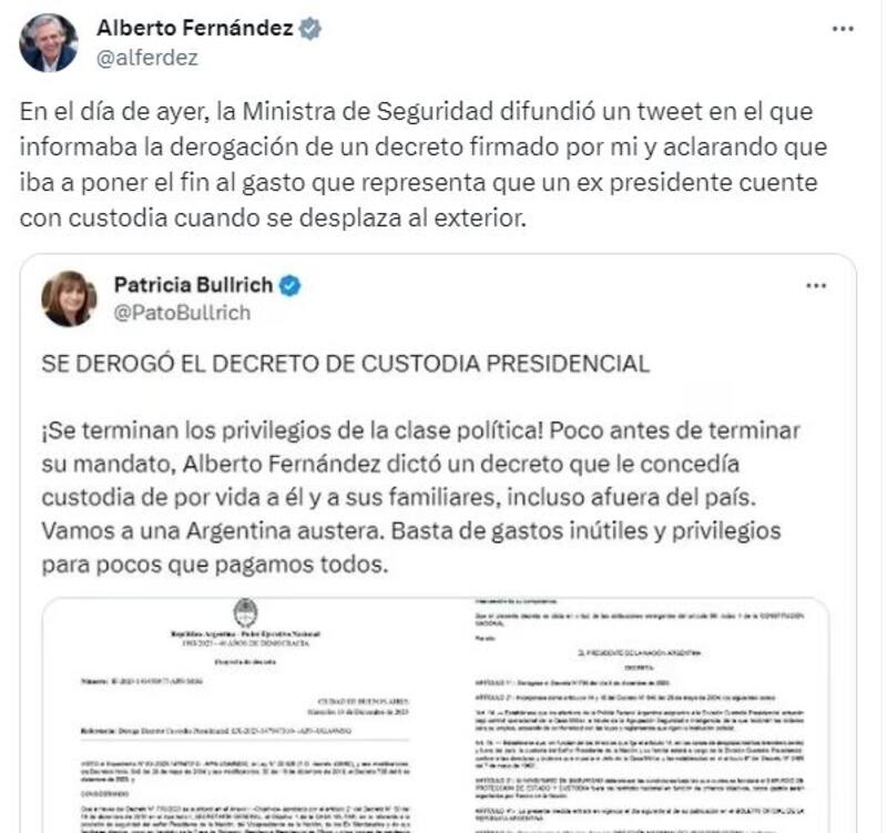 "El decreto 735/23 que yo suscribí, solo puso la dependencia funcional del servicio de custodias de los expresidentes y vicepresidentes en la Órbita de la Casa Militar y la Secretaría General, organismos que siempre tuvieron la función de custodia del presidente en ejercicio", explicó acerca de la disposición, dentro del extenso hilo que compartió en X.